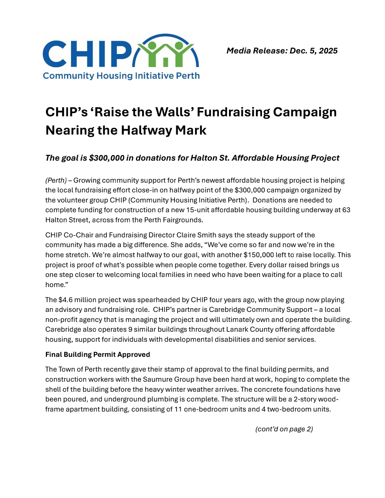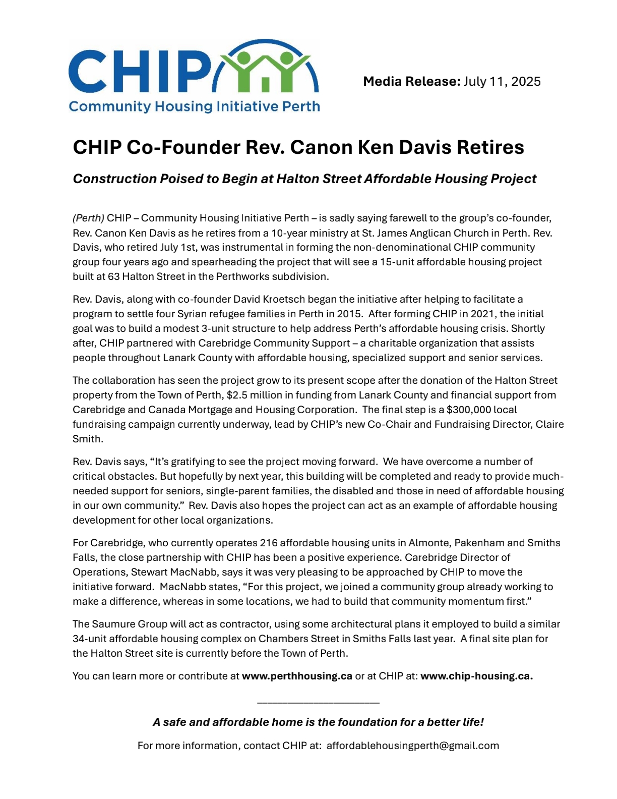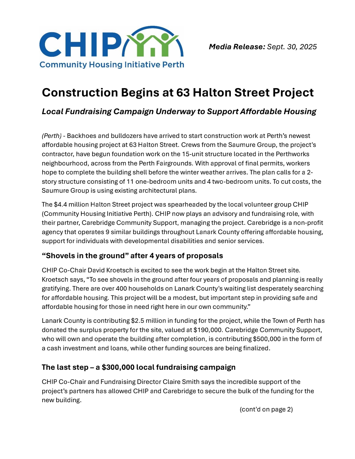 CHIP has partnered with Carebridge Community Support (an affordable housing provider in Lanark County) and the Saumure Group to build a 15-unit, two-story affordable housing structure in the heart of Perth at 63 Halton Street. The building will consist of 11 one-bedroom units and 4 two-bedroom units. CHIP will act as advisors during and after completion of the project and provide community support for future tenants.