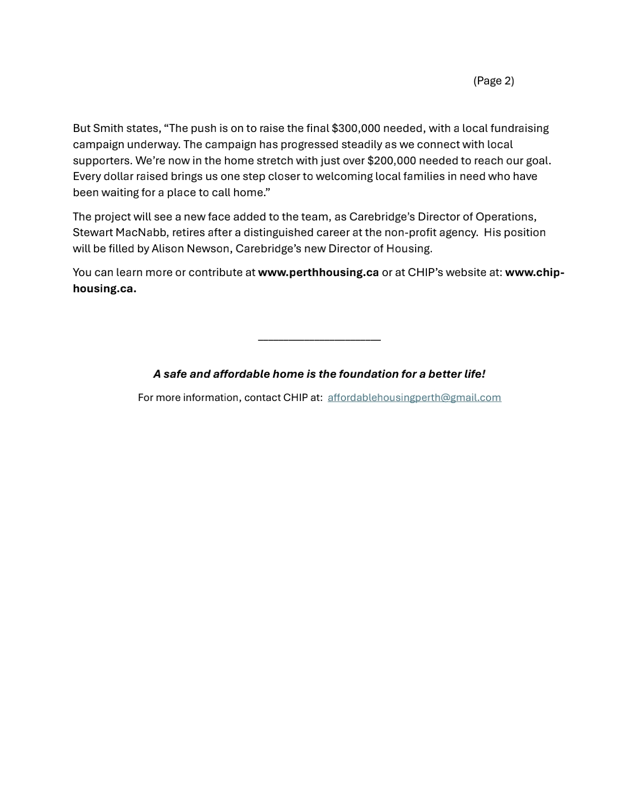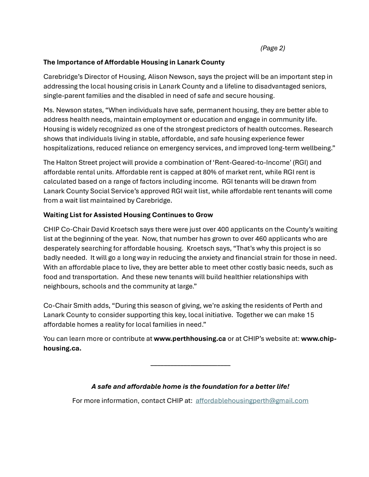 There are over 600 needy applicants on the waiting list for ‘Rent Geared to Income’ and affordable housing in Lanark County. Over 300 of these individuals and families are desperately looking to find housing within their means in the town of Perth alone. We believe the people of Perth and our elected officials can come together to address this pressing need.